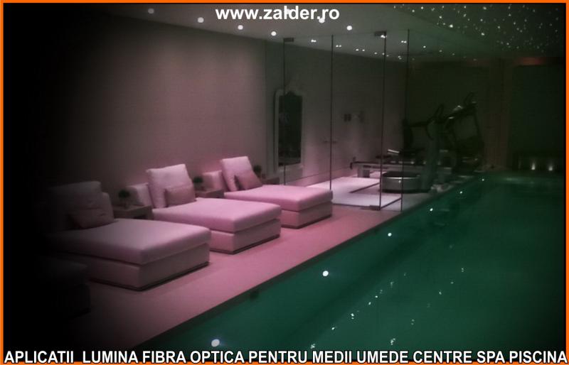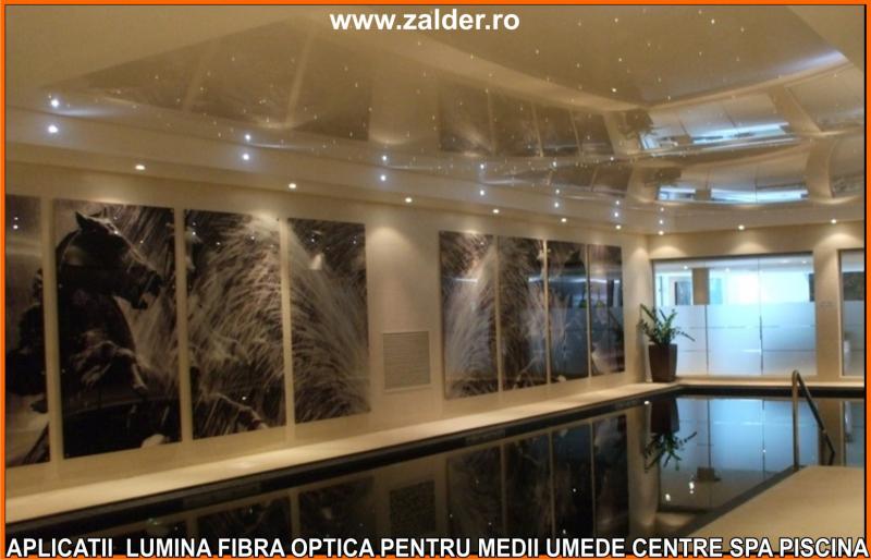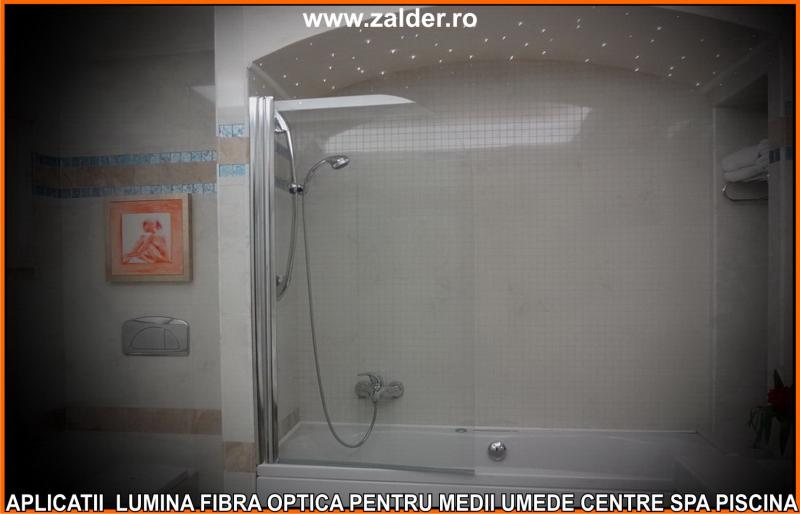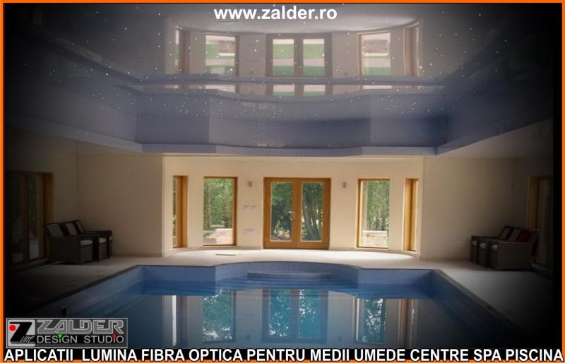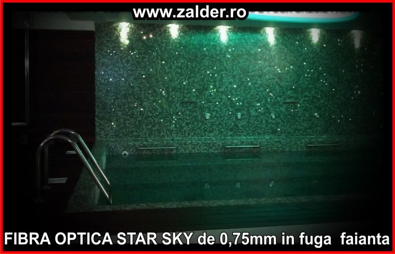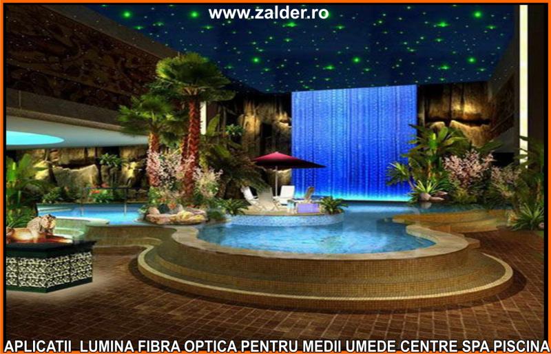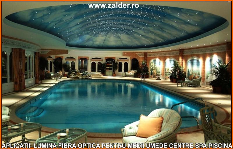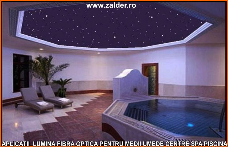 IN CENTRELE SPA, PISCINE, BAZINE, tavanele STAR SKY-CER INSTELAT, se pot monta pe tavane executate din gipscarton (de culoare verde) special rezistent in medii umede sau pe tavane tip STRETCH sau BARISOL (folii extensibile in culori metalizate sau chiar imprimate cu imagine la alegere). Caracteristica de a nu conduce decat lumina, face ca fibrele optice sa poata fi folosite pe langa tavane STAR SKY si in aplicatii subacvatice, ca efect de punct luminos din bazine, piscine, in fuga gresiilor sau faiantelor sau ca decor divers STAR SKY-punct luminos din mediile umede amintite mai sus. Lumina fibra optica folosita in aceste cazuri este aparata cu un strat exterior de protectie, aplicat peste fibrele optice. De obicei folosim legaturi care se desfac si se aplica (se scot din tubul protector doar in zonele unde urmeaza sa produca efectul luminos). Daca se doreste avem disponibile si spoturi inserabile in sape, ale caror lumina este data tot de fibrele optice.