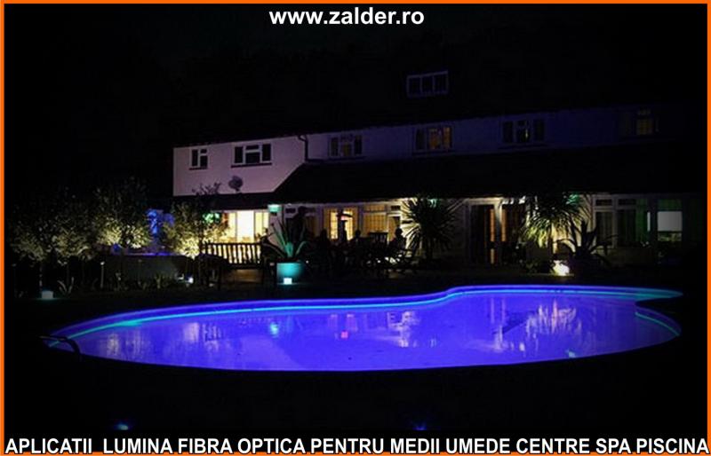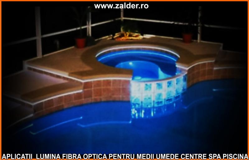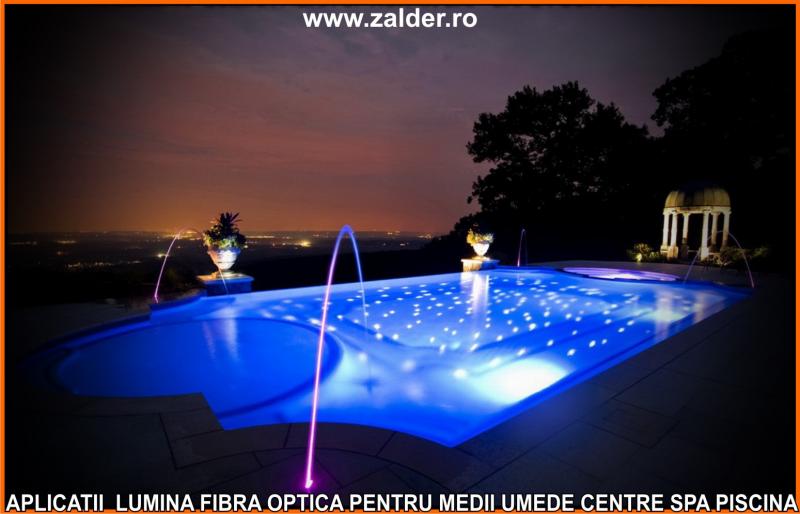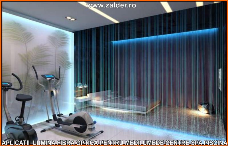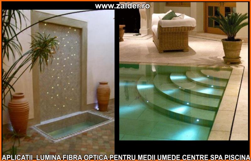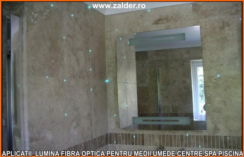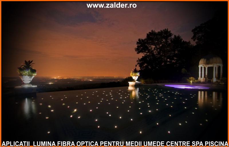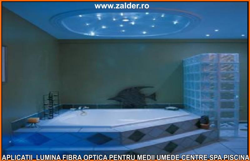 IN CENTRELE SPA, PISCINE, BAZINE, tavanele STAR SKY-CER INSTELAT, se pot monta pe tavane executate din gipscarton (de culoare verde) special rezistent in medii umede sau pe tavane tip STRETCH sau BARISOL (folii extensibile in culori metalizate sau chiar imprimate cu imagine la alegere). Caracteristica de a nu conduce decat lumina, face ca fibrele optice sa poata fi folosite pe langa tavane STAR SKY si in aplicatii subacvatice, ca efect de punct luminos din bazine, piscine, in fuga gresiilor sau faiantelor sau ca decor divers STAR SKY-punct luminos din mediile umede amintite mai sus. Lumina fibra optica folosita in aceste cazuri este aparata cu un strat exterior de protectie, aplicat peste fibrele optice. De obicei folosim legaturi care se desfac si se aplica (se scot din tubul protector doar in zonele unde urmeaza sa produca efectul luminos). Daca se doreste avem disponibile si spoturi inserabile in sape, ale caror lumina este data tot de fibrele optice.